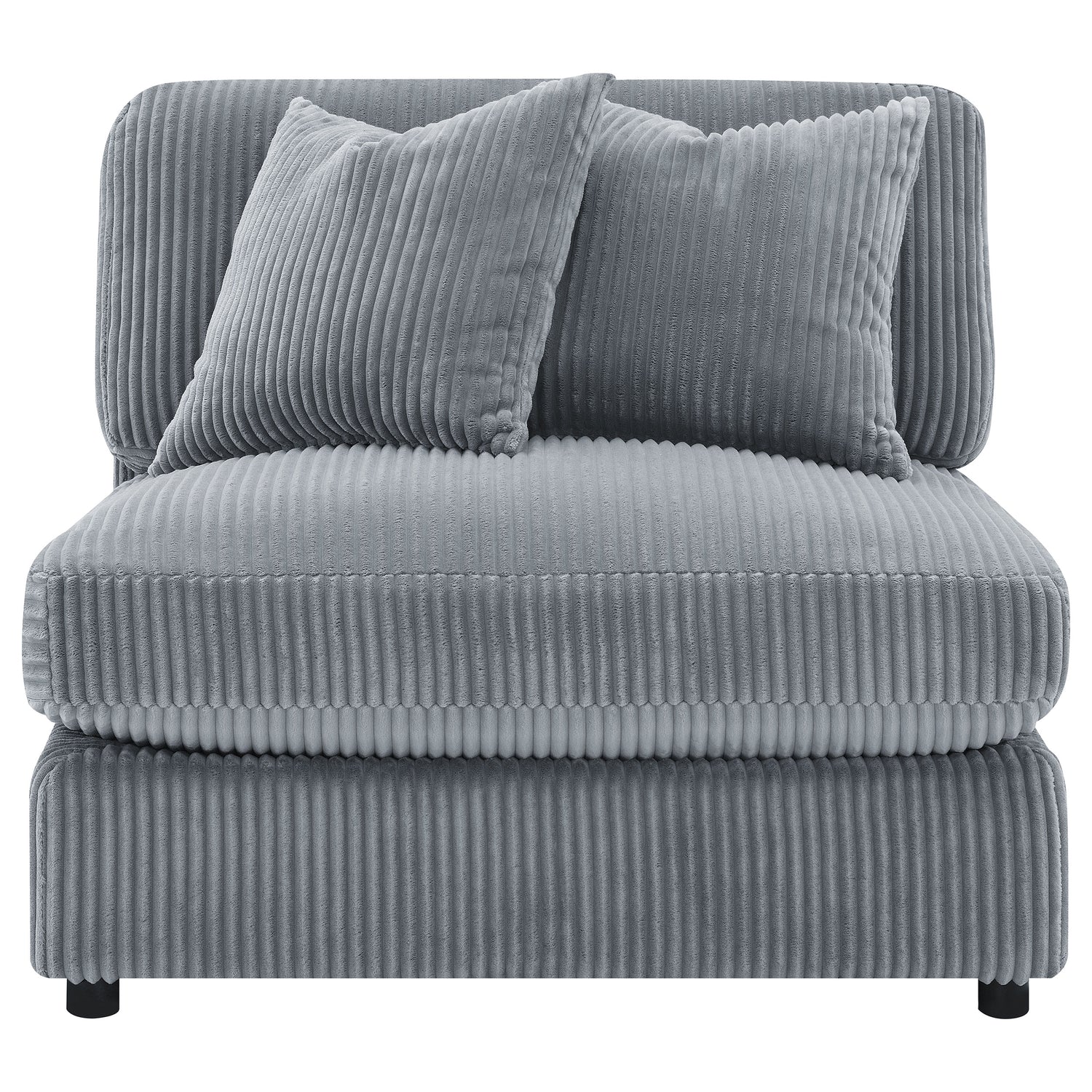 Instill cozy and inviting energy in your den or living room with a modern armless chair. Plush and comfortable, it features soft cushions and wide wale corduroy style upholstery in a soft neutral hue, perfect for augmenting existing seating. The seat and back cushions are each reversible, adding versatility and perfect for families and entertaining. Feet include non-skid grip to help keep the chair just where you place it within your space. Group couple by the fire, or add a cozy spot for reading and relaxing to your home office.