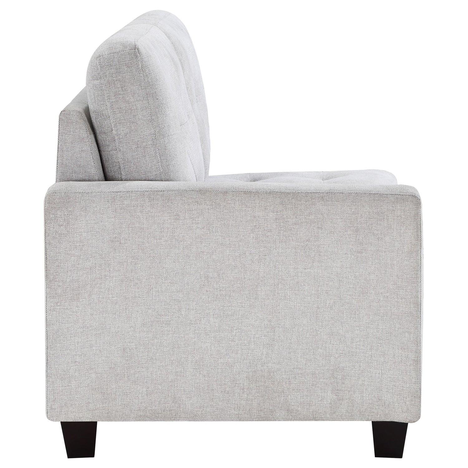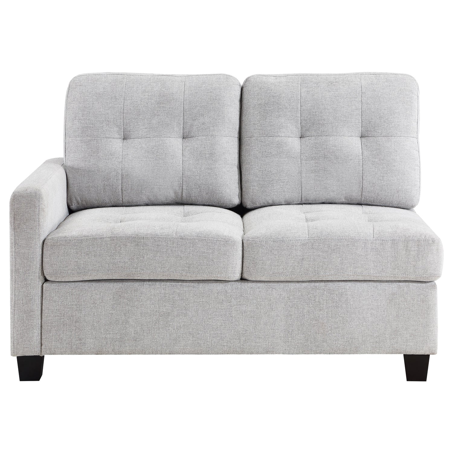 Create the sectional that suits your space with a modern left-facing loveseat with one arm. In soft beige upholstery, it's the perfect way to extend your Georgina collection sectional sofa, adding length and a finished look to suit your living room. The left-arm loveseat features tufted cushions, two back and two seat, and sinuous spring decking under the seat, offering impressive comfort and support. Legs are a black finish tapered block style, complementing surrounding decor while offering stability and support. This sectional piece is constructed with Asian hardwoods and plywood for optimal strength and durability.