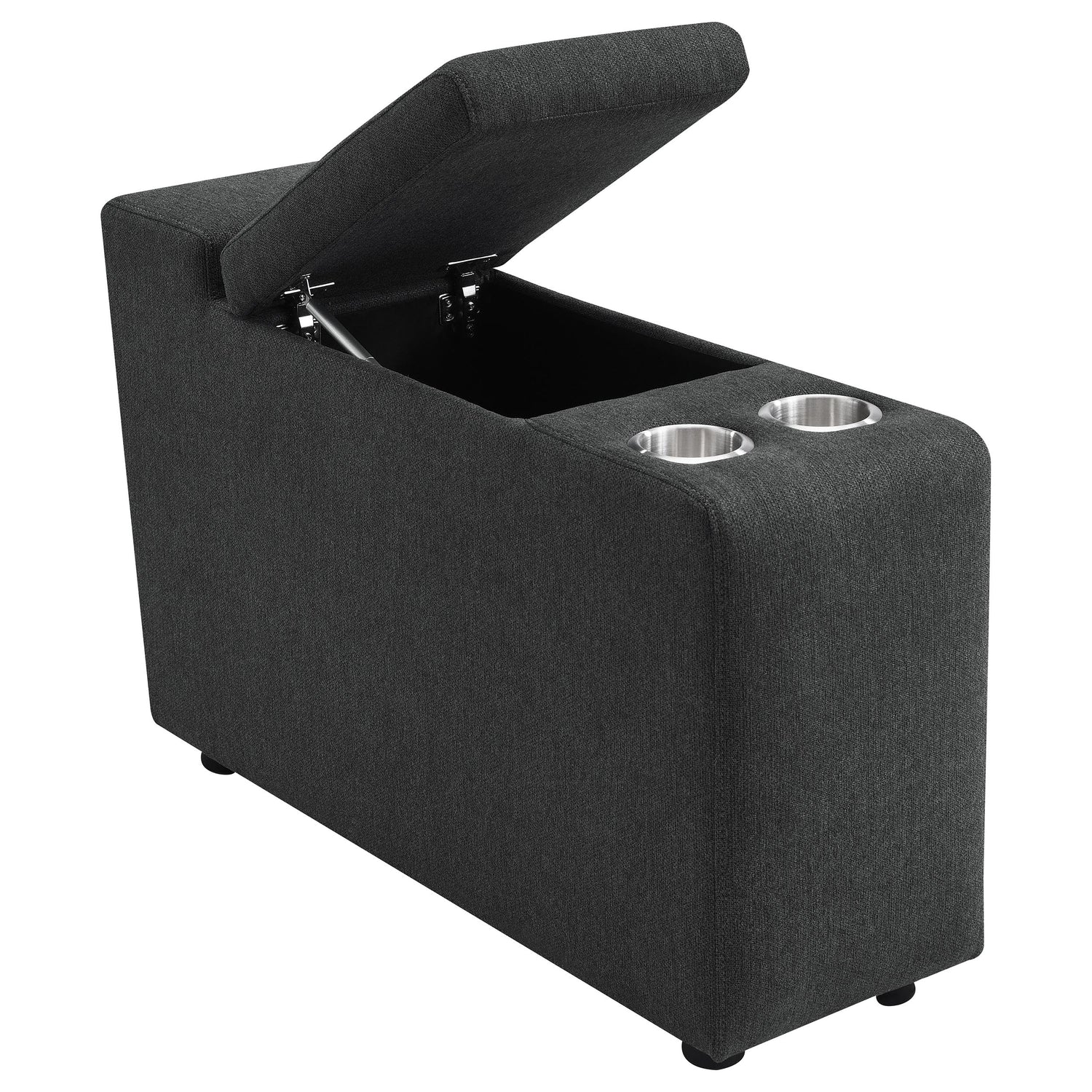 Elevate your sectional with this versatile console, designed to seamlessly integrate into your modular setup. Featuring a lift-top storage compartment for discreet organization and two stainless steel cup holders, this console enhances both functionality and convenience. Its compact design adds practical features without taking up extra space, making it a perfect addition to modern living spaces.