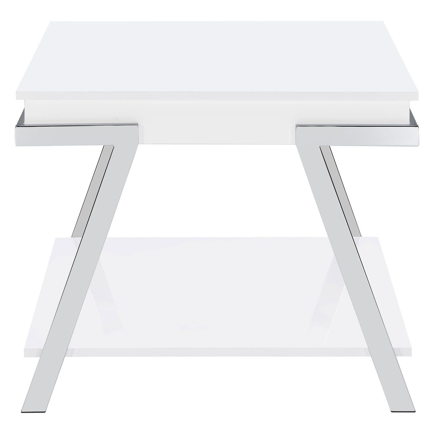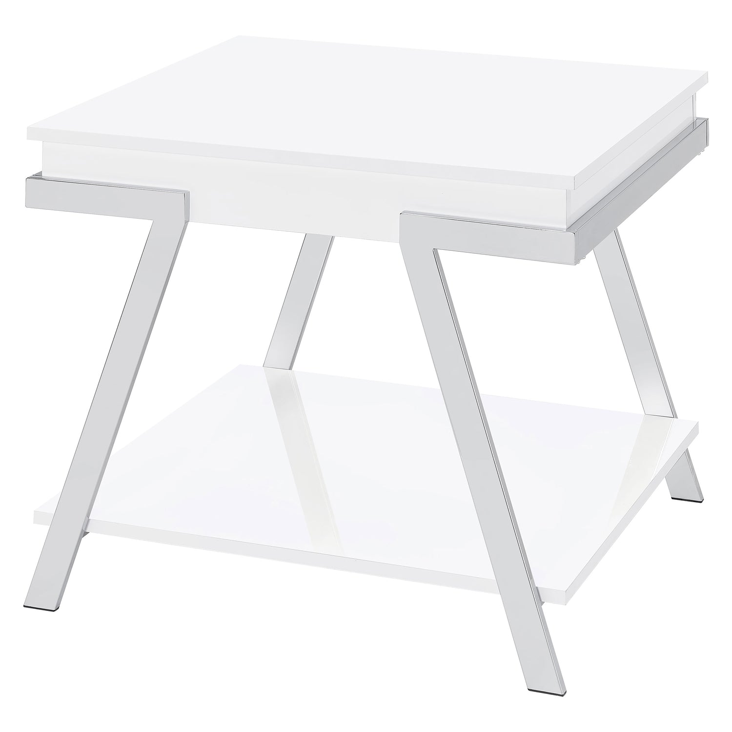 Go full-on modern with a casual feel that delivers a surprising energetic boost. This ultra-contemporary end table made of white high gloss finish MDF with paper coating creates a stir in your laid-back living room or family room. Angular metal framing adds a fresh aesthetic boost. A modular-like configuration works well in today’s trending spaces as this end table increases storage and display space with a lower shelf. Seek a seamless contemporary attitude with this stylish end table.