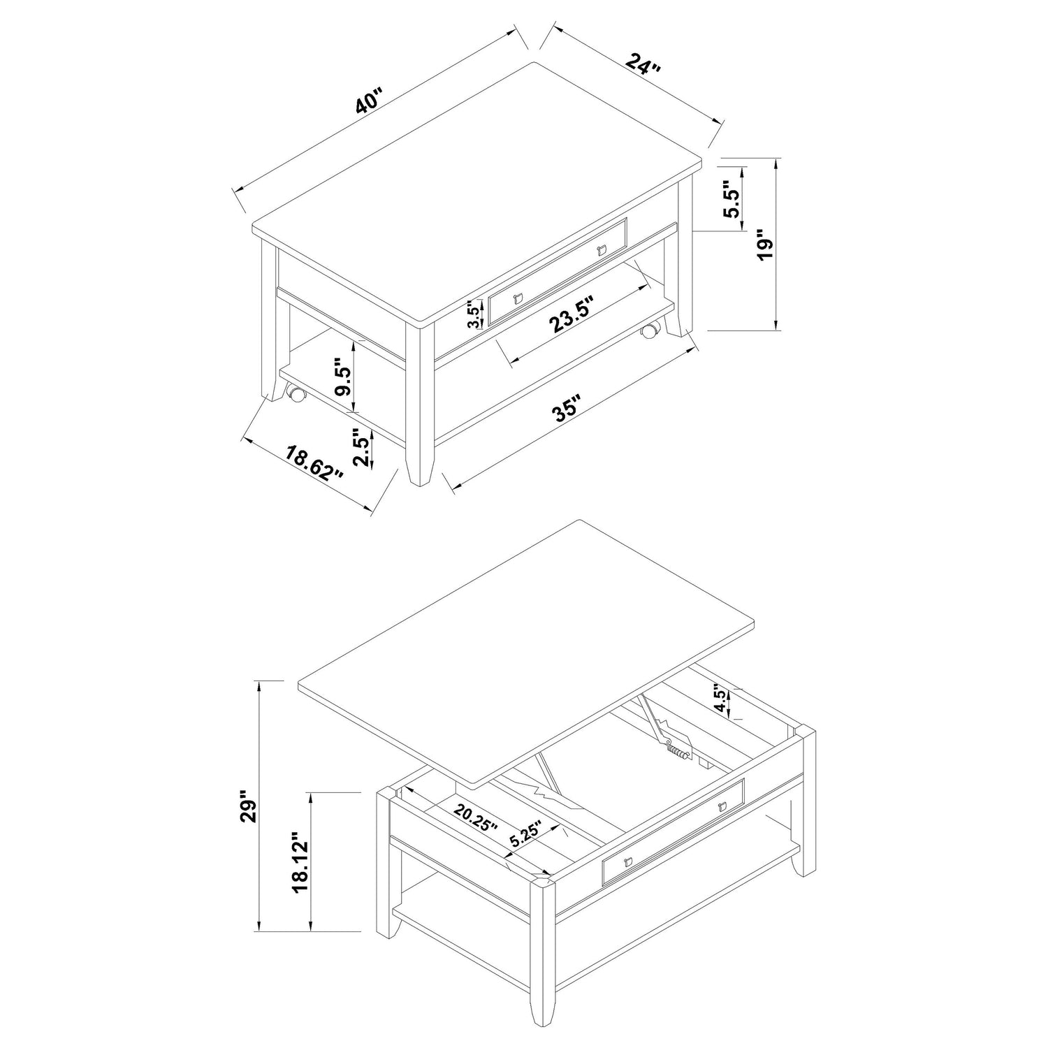 This 40-inch lift-top coffee table seamlessly blends style, functionality, and mobility. Crafted from poplar, plywood, and engineered wood with birch veneer, it features a rich walnut finish that adds warmth to any space. The lift-top design reveals a spacious hidden compartment, while a lower shelf provides additional storage. Equipped with smooth-rolling casters, this table offers easy mobility for versatile use. A single drawer with nickel hardware completes its sleek, transitional design.