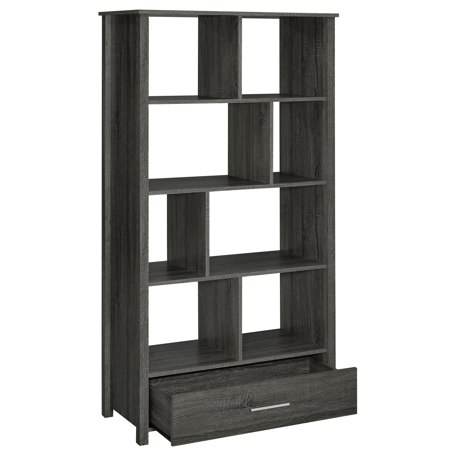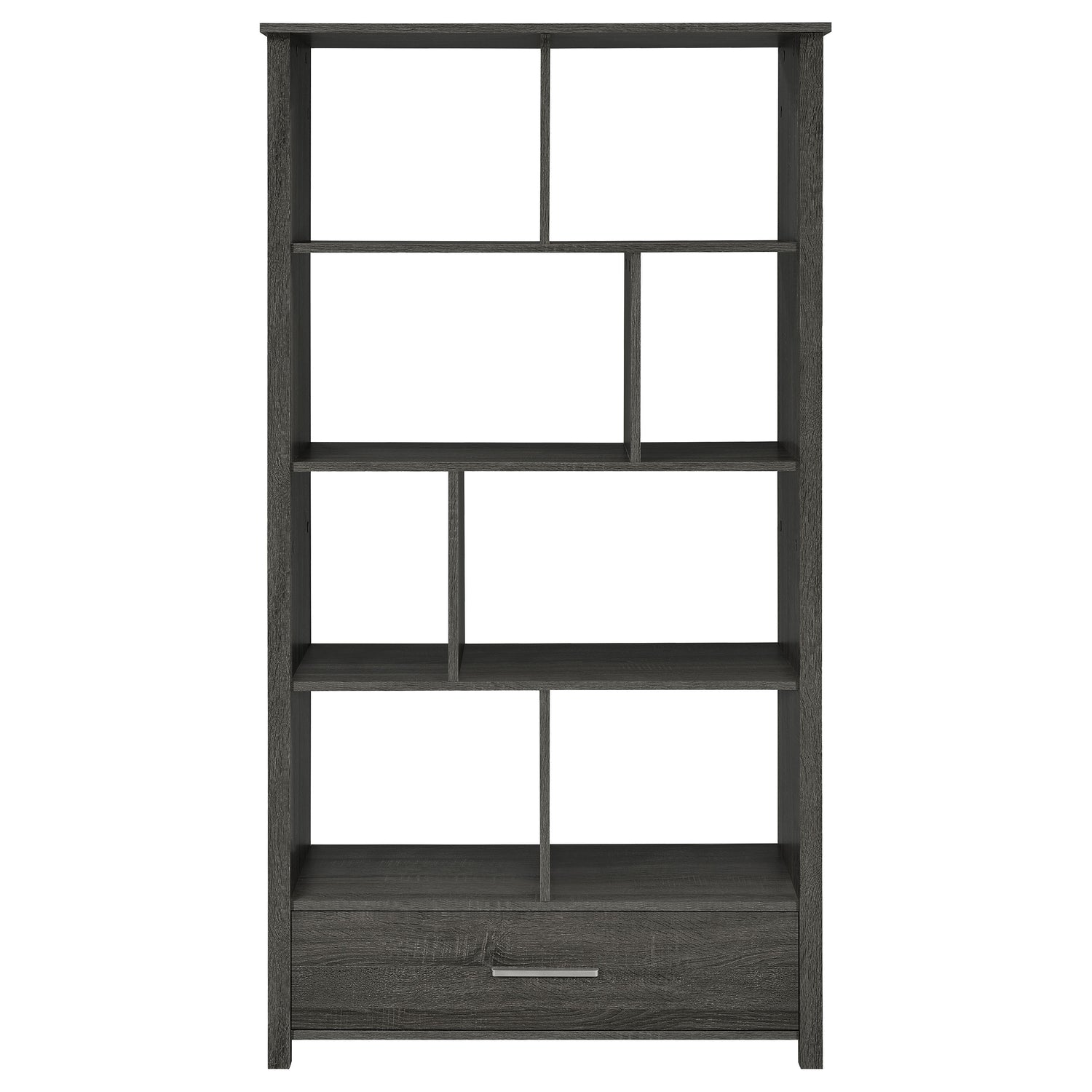 Asymmetrical shelves stack against one another to create this stunning, contemporary bookcase. A stylish, eye-catching addition to a home office, this minimalist bookcase invites you to organize office accessories or showcase decor and family photos. Eight separate sections divide items categorically if you wish, while a bottom drawer keeps items out of sight. The single drawer is adorned with a sleek, brushed zinc pull that further lends to the chic nature of this bookshelf. Versatile and functional, place this tall bookcase in the room of your choosing.