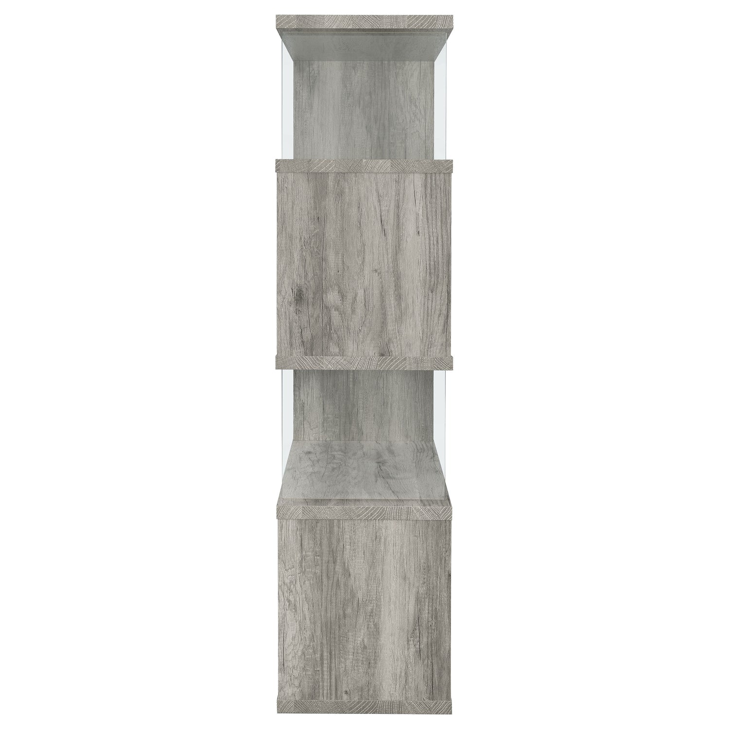 The asymmetrical zig-zag design of this contemporary bookcase creates a focal point in any room. Five open shelves in a light grey driftwood finish stack elegantly, supported by clear glass side panels that lend a modern flair to this furniture piece. Perfect for home offices, living rooms and much more, showcase anything from a book collection, decor, and other favorite items for all to see. With a flush base, this open bookcase unit rests sturdily and securely on the floor. Clean lines and a wonderful jagged design offer up style, functionality, and a stunning display.