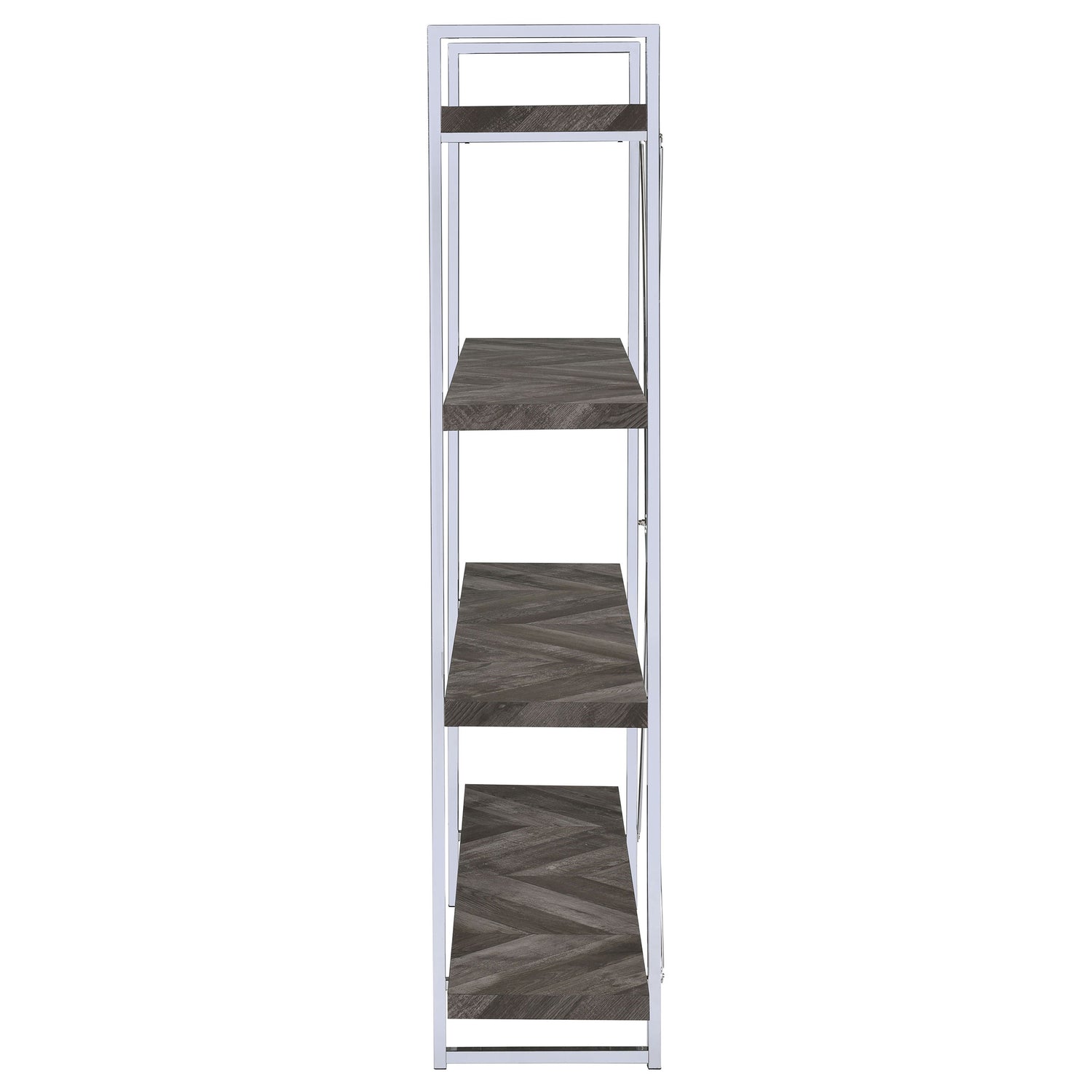 Enhance your storage and display space with this contemporary bookshelf, featuring a rustic grey herringbone finish for a modern organic touch. The sleek chrome metal frame provides durability and style, complemented by an X-shaped back support for stability. Four open shelves extend beyond the frame, creating a bold, geometric aesthetic perfect for showcasing books, décor, or collectibles. Crafted from engineered wood and metal, this shelving unit blends industrial and modern styles seamlessly, making it a stunning addition to living rooms, offices, or bedrooms.