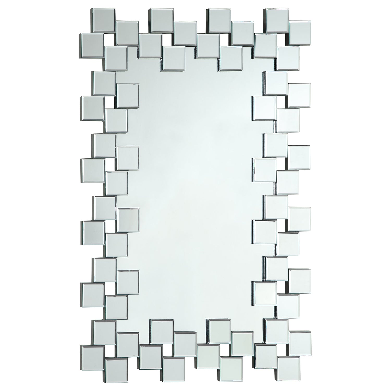 Add striking dimension to any room with this frameless wall mirror featuring a geometric mosaic edge. The center rectangular mirror is bordered by a dynamic pattern of staggered square tiles that reflect light and style from every angle. Ideal for modern interiors, this mirror doubles as a functional décor accent in entryways, bedrooms, or dressing spaces.