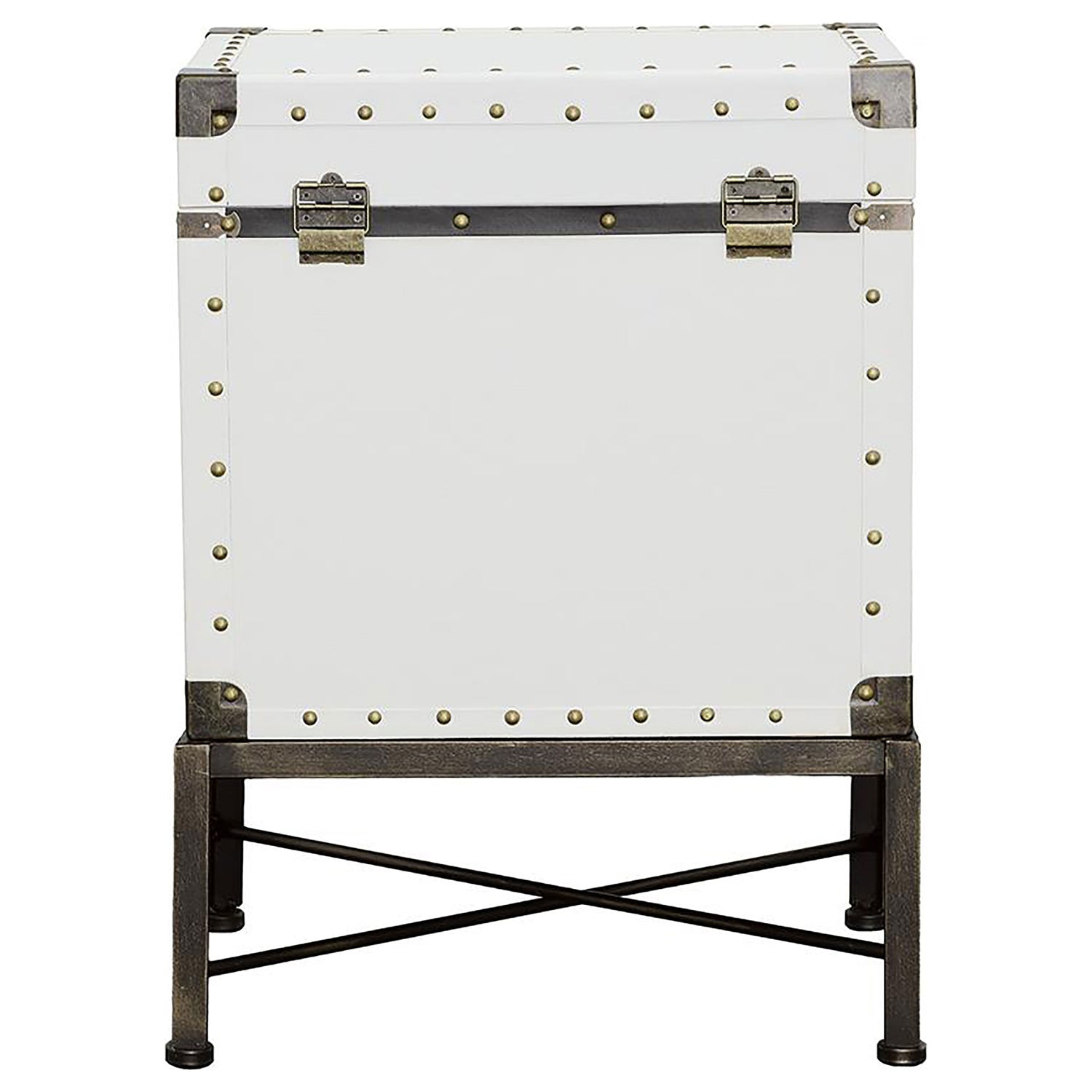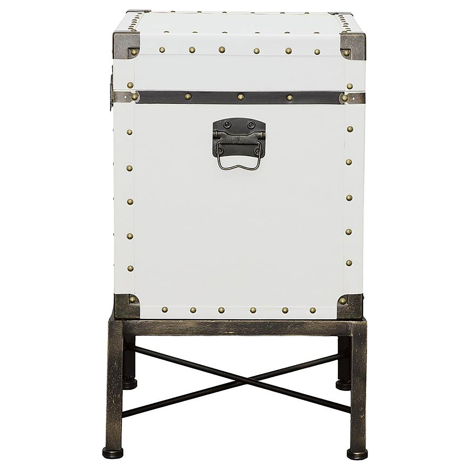 Add vintage-inspired charm to your space with this versatile side table and storage trunk combo. Upholstered in a smooth white leatherette, it features brushed brass nailhead accents for a touch of elegance. The sturdy metal base, finished in a brushed bronze tone, provides stability and complements the design. The functional trunk offers ample storage for blankets, books, or essentials. Perfect as an accent or end table, this piece blends form and function beautifully.