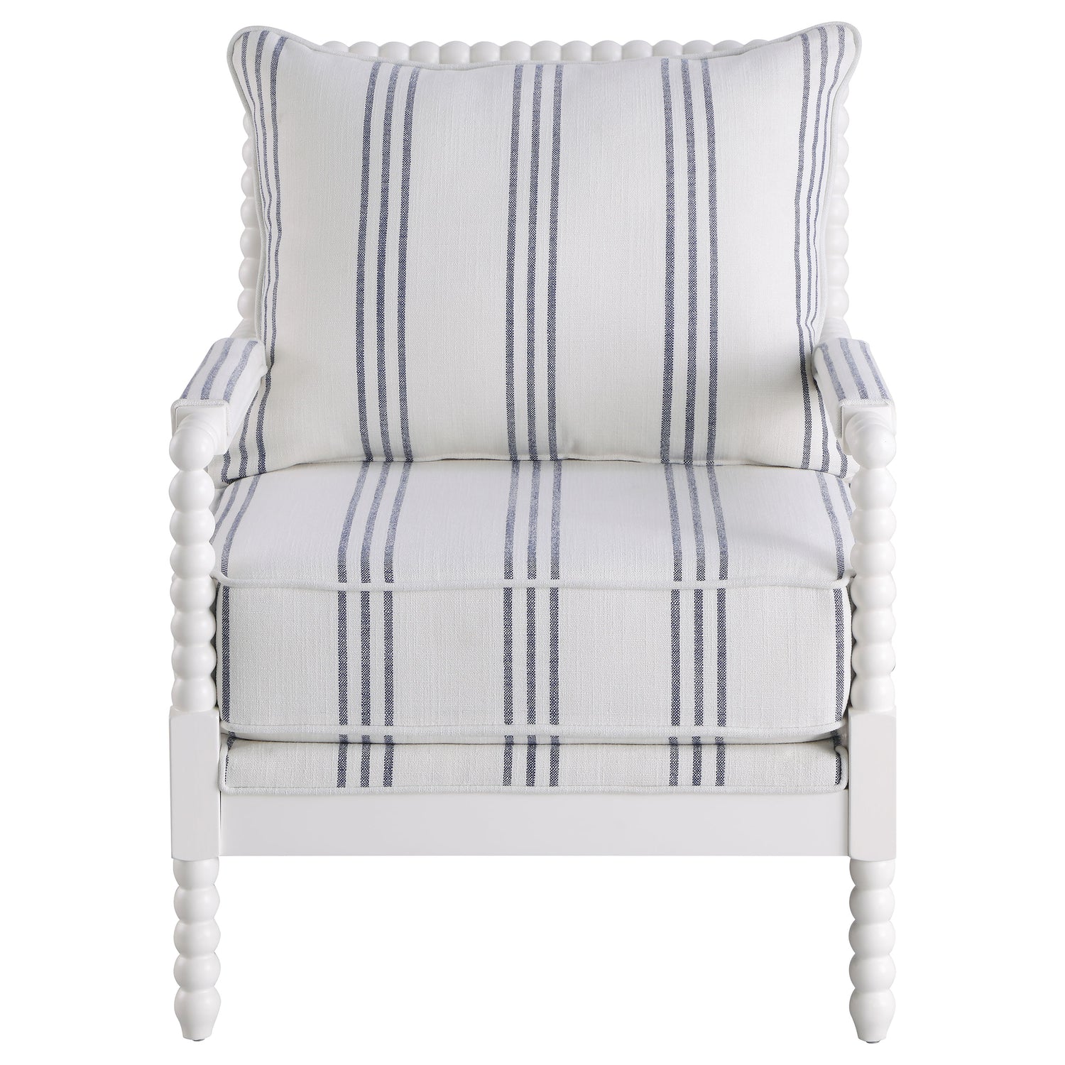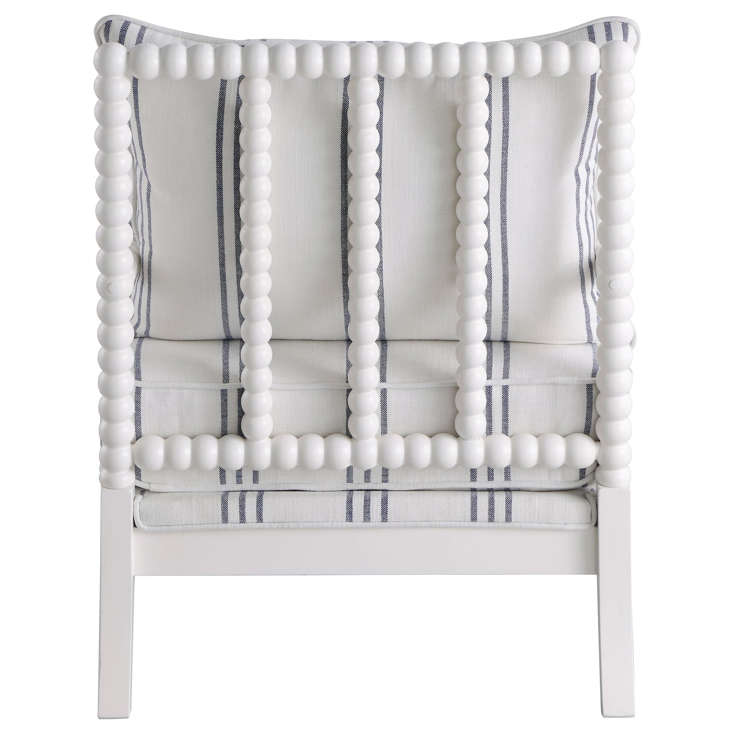 Light and bright as can be, this contemporary accent chair offers a cheerful look to any space. This accent chair offers comfortable seating with each cushion wrapped in a white linen-like upholstery accented with navy awning stripes. With a sharply designed frame that includes decorative spindle back posts, legs and armrests, all in bright white finish, this accent chair lends a subtle boho style. In addition, this accent chair offers extra details such as padded armrests and welt trim. Place this nautical-inspired accent chair on a covered veranda or a sunroom for a crisp, clean look.