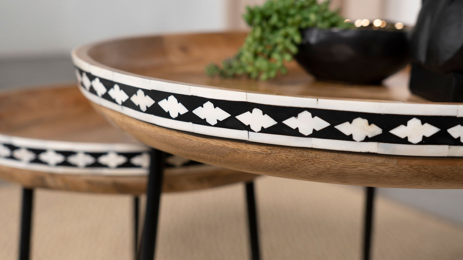 Exquisite inlaid bone creates an artisan touch on this pair of boho nesting tables. Crafted from beautiful, warm mango wood, each table features a round tray style top that creates a home for decor and a place to set refreshments. The inlaid pattern highlights the outer edge of each tabletop, which sits atop four tapering metal legs with a flared presentation that adds vintage inspired character. This charming table set is fantastic displayed together to create a layered, waterfall effect that's beautifully on-trend without trying too hard to be trendy. The tables are equally lovely places apart, offering a coordinated look and feel that brings cohesion in your living room or den.