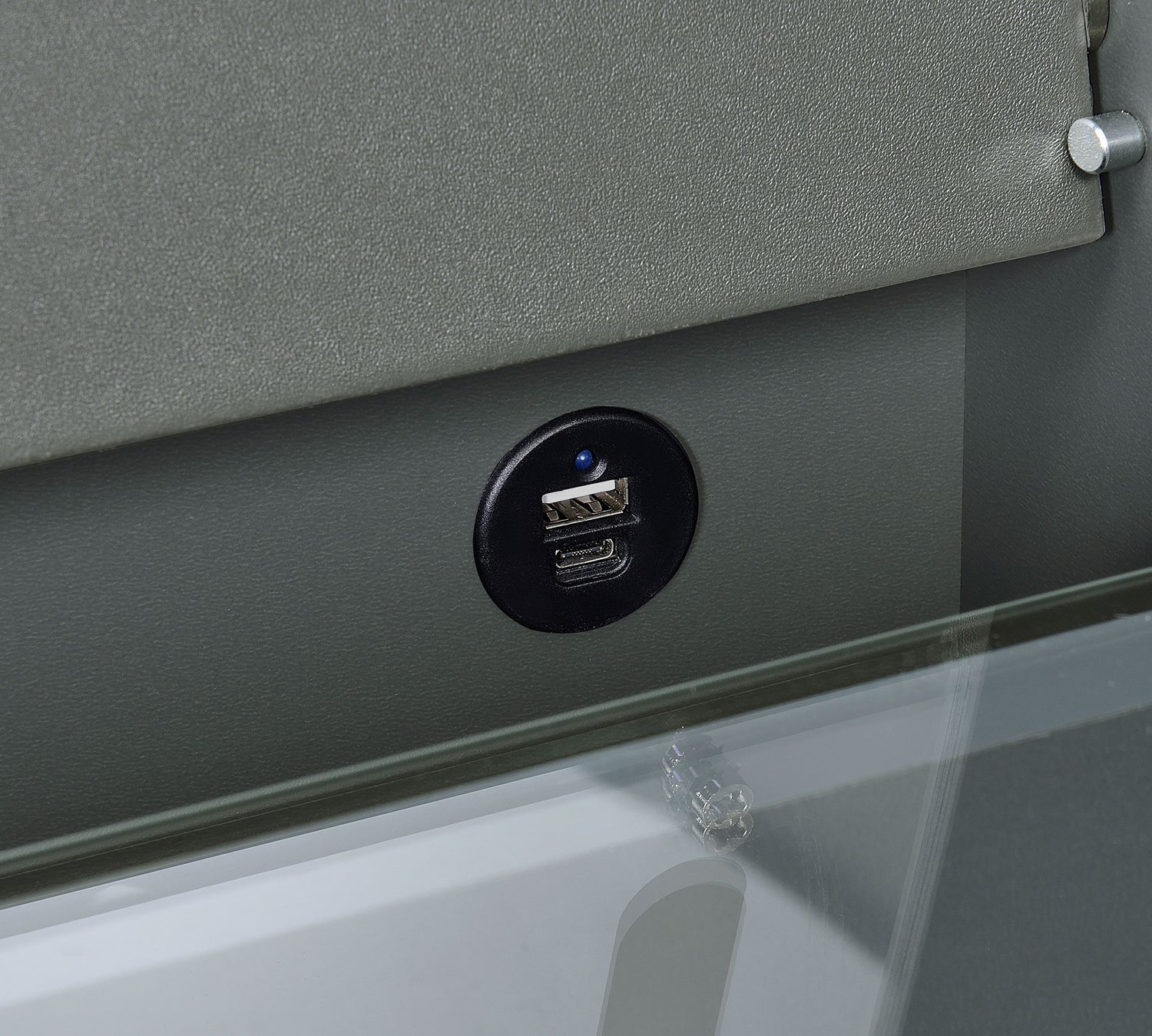 This high gloss makeup vanity set, crafted from engineered wood with eco-friendly laminate, blends seamlessly into your bedroom, doubling as a chic chest of drawers. The flip-top vanity mirror with LED lighting offers perfect illumination, while built-in dual USB outlets (Type A and Type C) allow for convenient device charging. The clear glass tabletop reveals a compartmentalized drawer for easy organization, and the cushioned vanity chair includes extra storage. Clear acrylic and chrome pull handles add a modern, elegant touch.