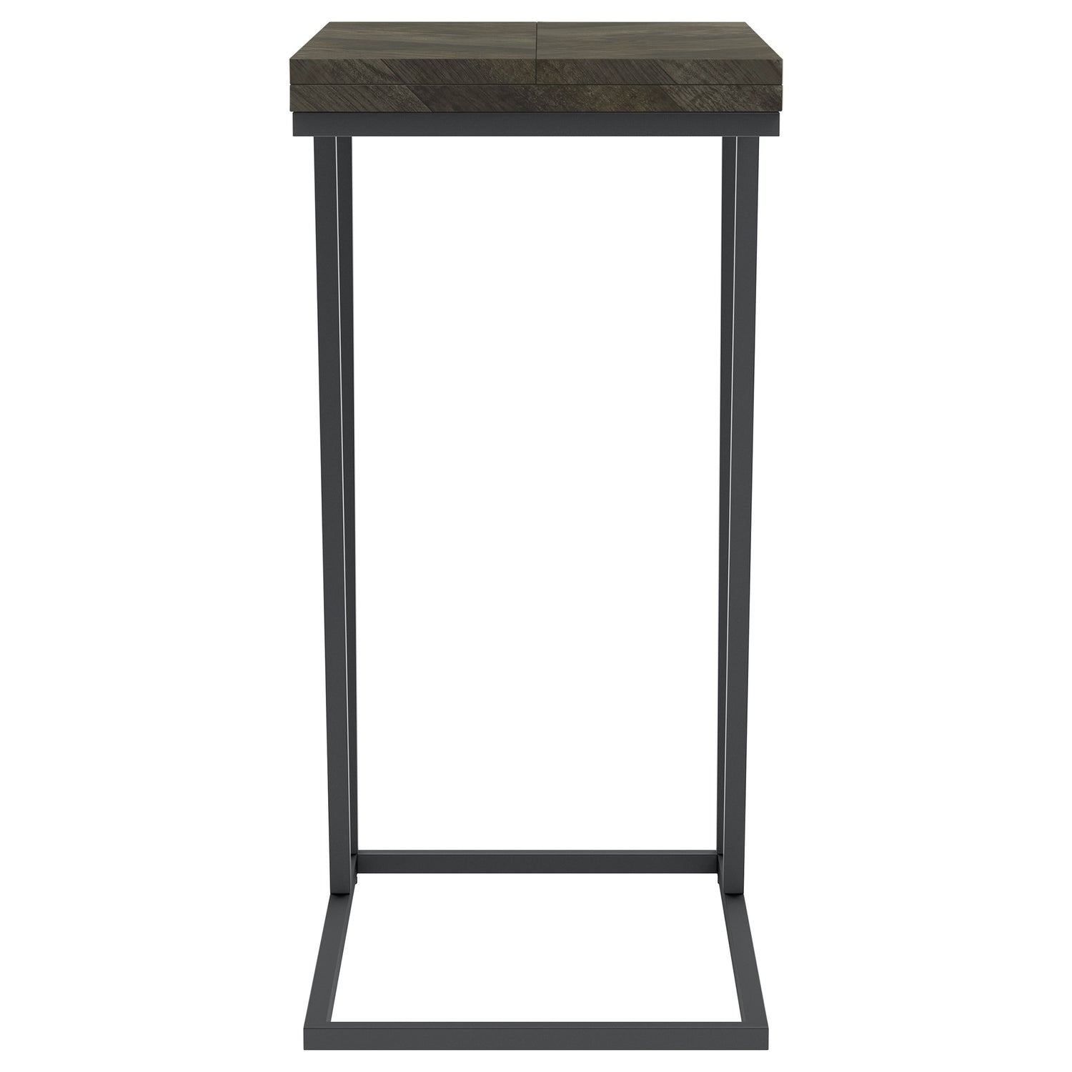 This versatile C-table combines functionality and sleek design, perfect for modern living spaces. Crafted with an engineered wood top featuring a scratch-resistant rustic grey laminate veneer, it offers durability and style. The top folds out, providing expanded surface area when needed. Supported by a sturdy metal base with a sandy black powder coated finish, it blends practicality with elegance. Its slim profile allows it to slide easily under sofas or chairs, making it an ideal space-saving solution.