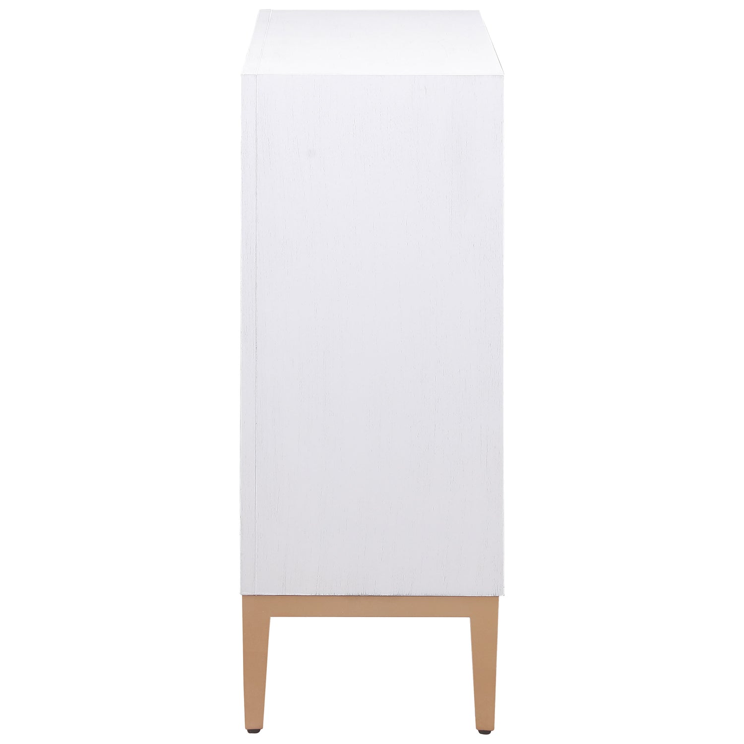 Bring a sense of dimension to any space that needs a boost with this modern accent cabinet. It features two doors that open to reveal an adjustable shelf, perfect for keeping organized in your entry, living area, den or bedroom. Its white finish is crisp and light, with contrasting light brown in linear geometric door designs and its base. Doors add character with textured linework that creates a chic diamond design, perfect for adding artisan character in your space. A matching light brown base and tapering legs create a sense of structure and stability, perfect in your foyer or home office.