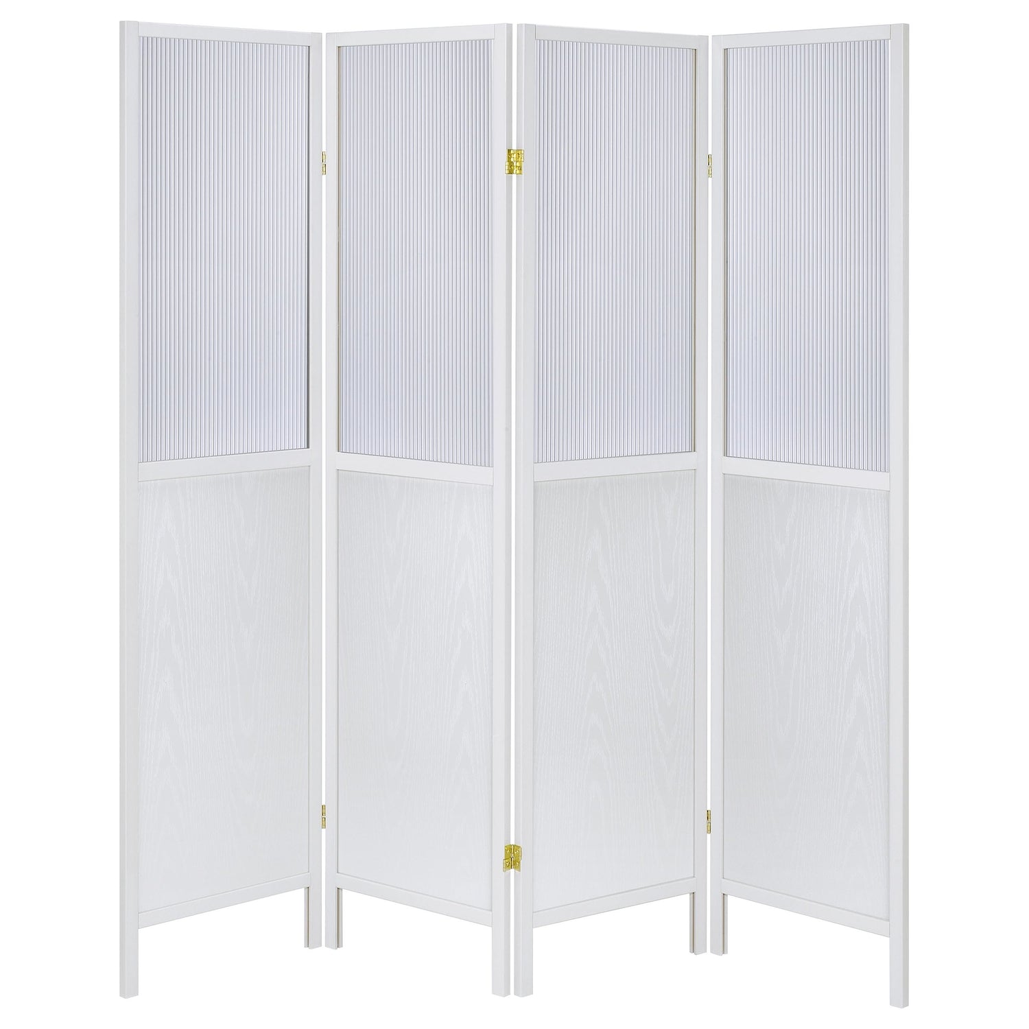 Create the perfect sense of division in your open living space with a transitional four-panel room divider. The freestanding piece offers four tall panels, each divided with a semi-opaque top section that allows light to pass through. The panels are ideal for a large primary suite, creating a sense of privacy for dressing or to section off a desk. The frame of each panel features a neutral finish and a solid lower panel for excellent performance and privacy. The lower panels includes a wood grain finish that's subtle, offering a touch of dimension to any room.