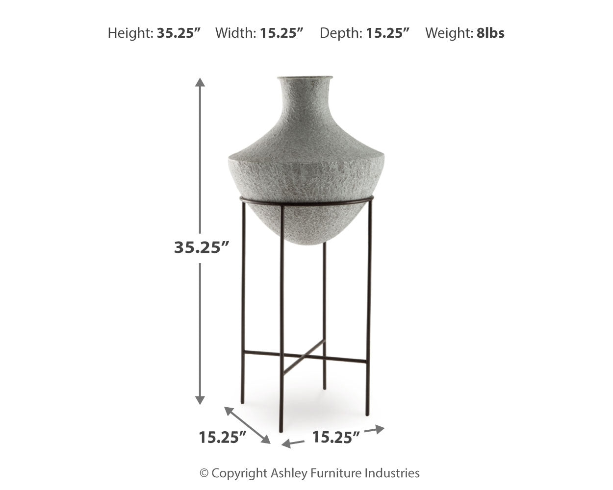 Take an effortlessly inviting approach to floor decor. This vase's distressed, textured look in a neutral hue pairs with a variety of casual color palettes. An espresso brown stand adds charming contrast to the look. And this vase enthusiastically welcomes faux florals and filler, perfectly adapting to the seasons when you swap out your arrangements.