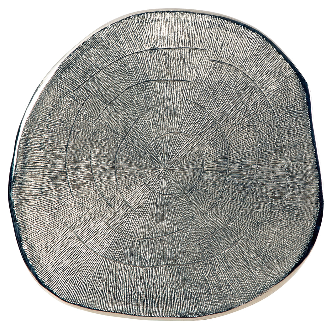 Rich with curated character, this end table puts a contemporary spin on natural beauty. Its irregular grooved top is refined with the glamour of a gleaming chrome-tone finish. A black base completes this cool piece.