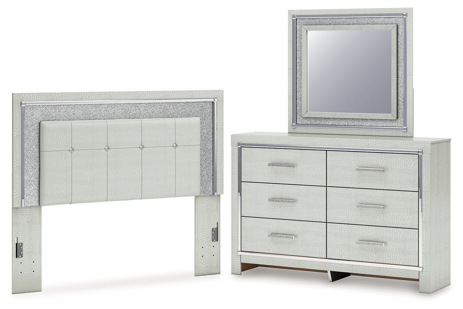 Zyniden Queen Upholstered Panel Headboard, Dresser and Mirror - Queen Upholstered Panel Headboard, Dresser and Mirror / Silver is backordered and will ship as soon as it is back in stock.